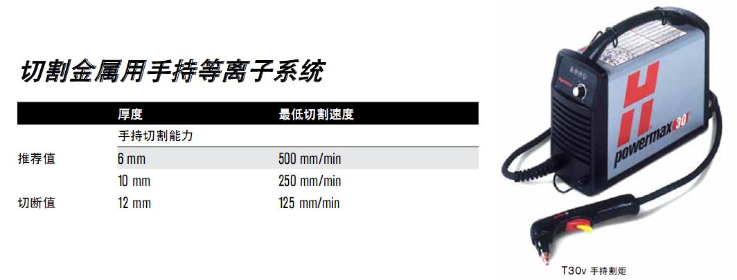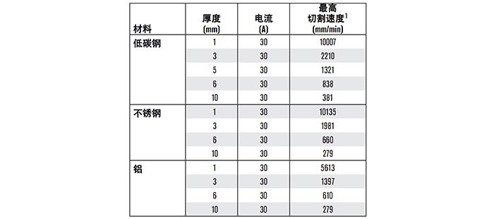 最大切割速度是根据 Hypertherm 实验室测试所得的结果。为达到最佳切割性能,各种切割应用的实际切割速度可能有所不同。有关更多详情,请参考《操作源手册》。