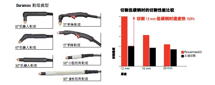 • 切割速度快:在切割 12 mm 低碳钢时,切割速度比火焰切割快 150%。