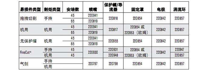 割炬易损件可提供各种数量的喷嘴和电极。有关更多信息,请联系您的经销商。